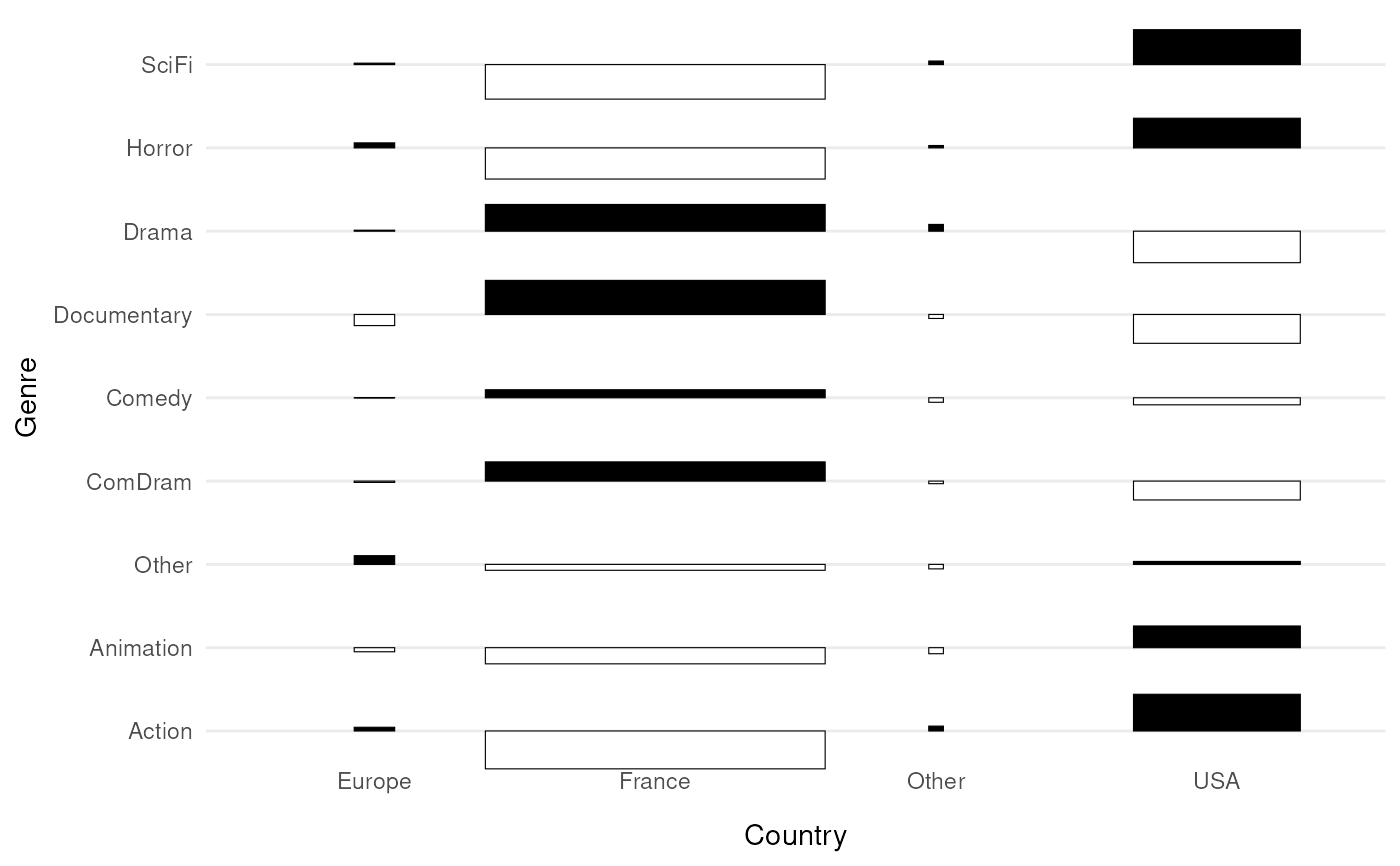 The measure of association measures how much each combination of categories of x and y is over/under-represented. The bars vary in width according to the number of observations in the categories of the column variable. They vary in height according to the measure of association. Bars are black if the association is positive and white if it is negative.