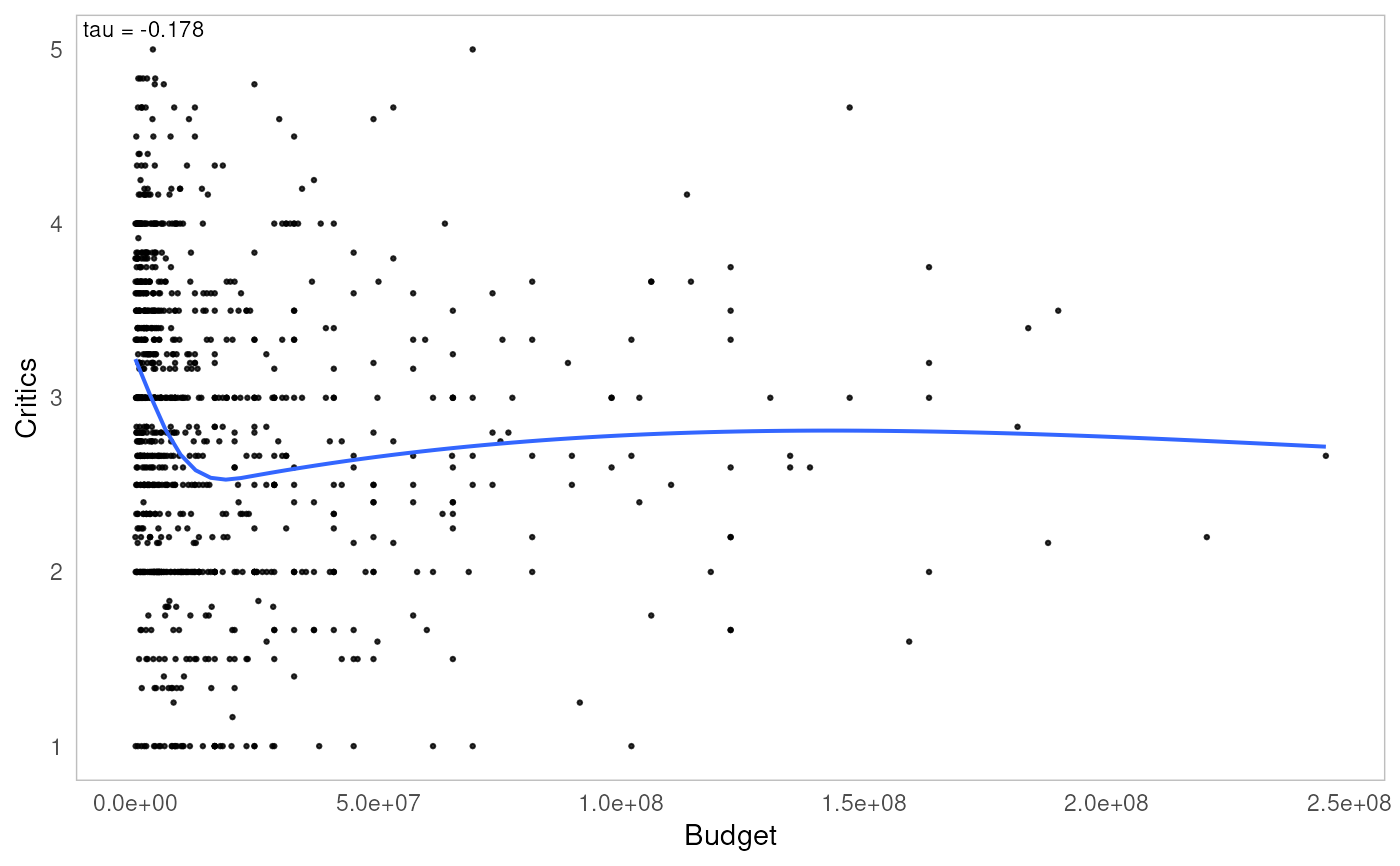 Kendall's tau rank correlation between x and y is displayed in upper-left corner of the plot.